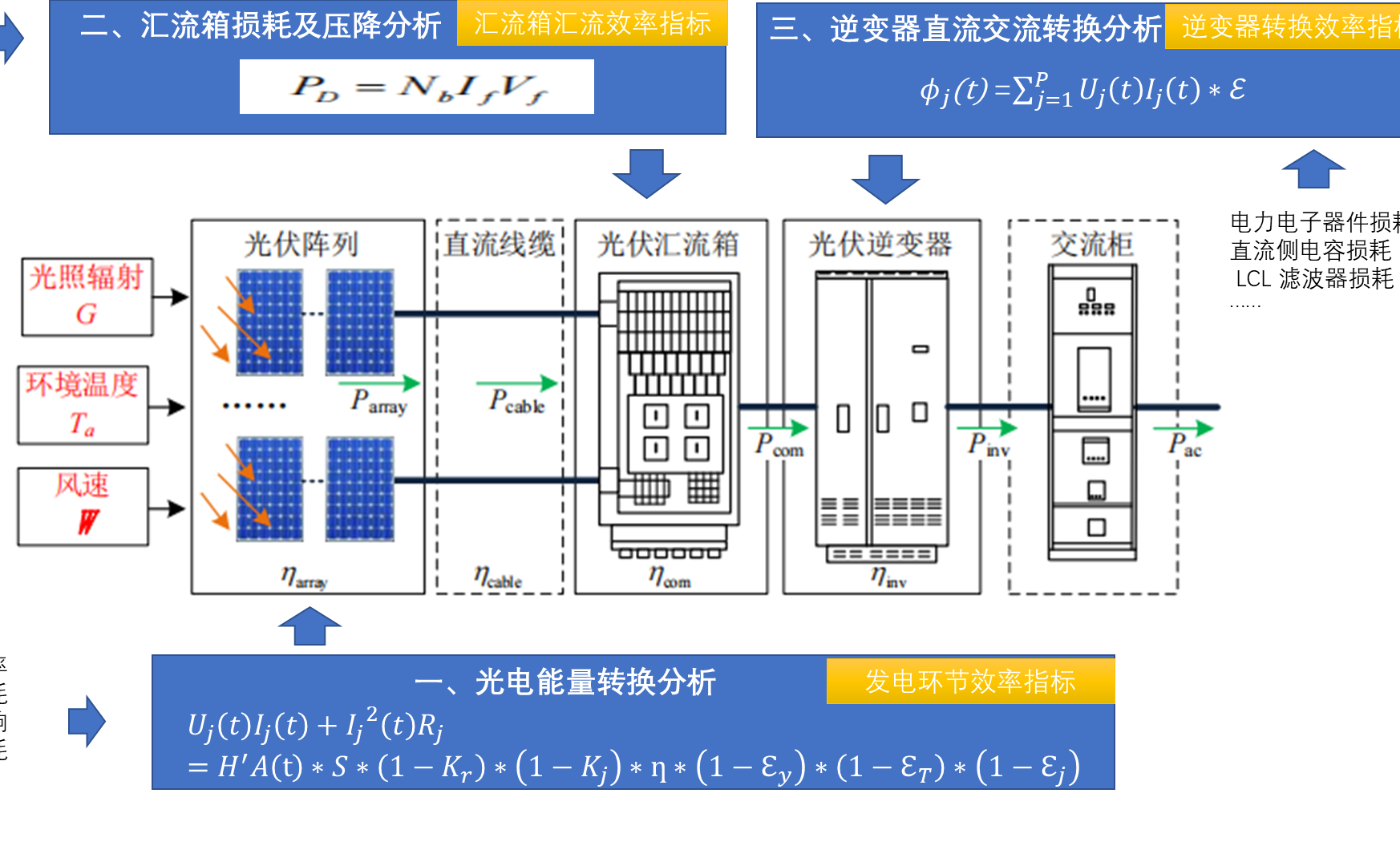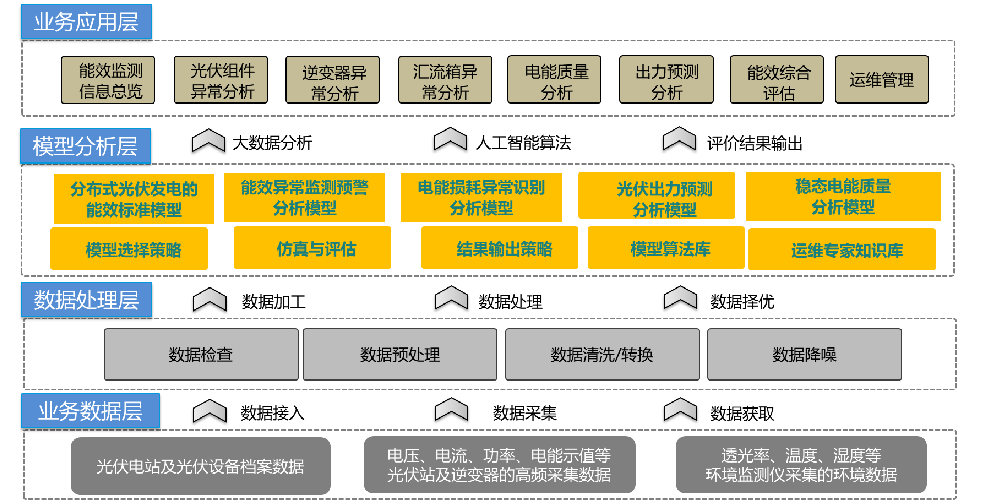 建立光伏发电能效标准模型,计算分析光伏组件、汇流箱、逆变器等关键部件的转换效率,监测光伏电能生产的能量流动全过程,实时预警能效异常情况