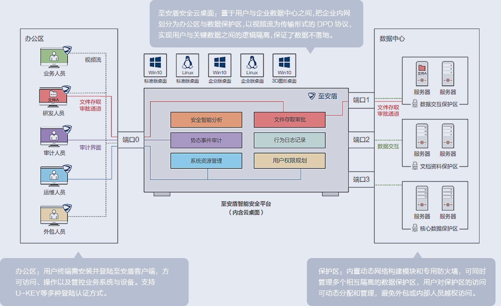 至安盾是以企业数据和业务的安全为中心,融合安全分区隔离、安全桌面、数据安全交换、用户行为分析和安全态势审计等多功能一体的智能安全平台