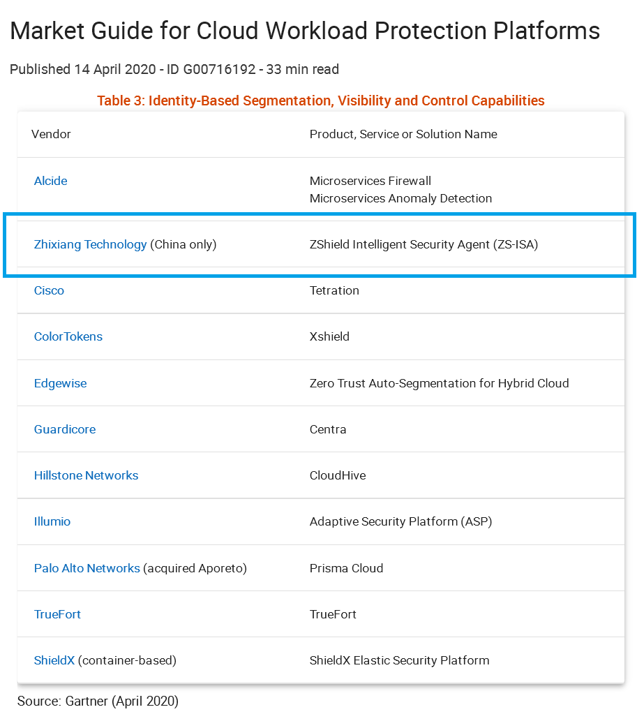 2020.04.16 2020年4月14日,Gartner发布了2020年全球云工作负载保护平台(CWPP)市场指南,志翔科技再次与卡巴斯基、Cisco、VMware、微软、McAfee等国际顶尖安全公司并列,连续第二年入选报告。其中,志翔科技的至明?安全探针产品(ZS-ISA)被归类为Gartner云工作负载?;て教ㄊ谐≈改夏谒ㄒ錍WPP八大类别中的“基于身份的安全隔离、可视化与管控”。