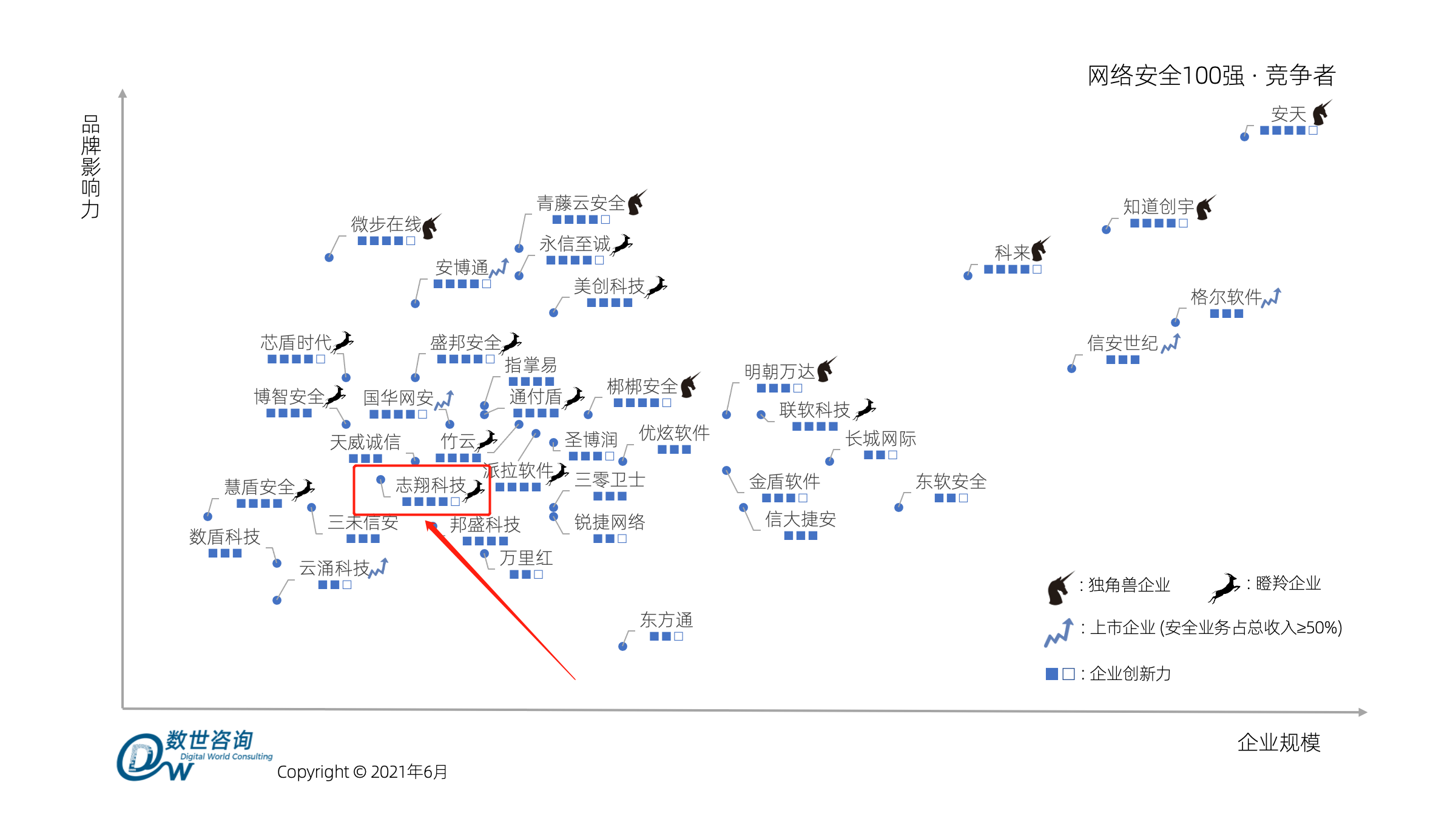 2021.06.16 2021年6月16日,北京。国内数字化产业第三方调研与咨询机构数世咨询发布《中国网络安全百强报告(2021)》(以下简称“百强报告”)。志翔科技入选综合实力百强的竞争者序列,被报告定义为竞争者中的“瞪羚企业”。