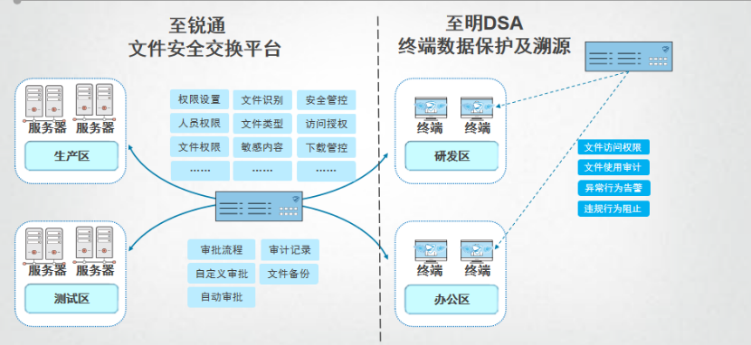 该方案结合志翔至锐通ZS-DSE数据安全交换和至明台ZS-DSA文件安全与溯源产品,融合了志翔自研的数据隔离、数据分级分类、数据标签溯源、自适应策略引擎和UEBA等多项技术,根据实际业务需求,可在企业内部建立生产区、测试区、研发区、办公区、交换区等多个区域。