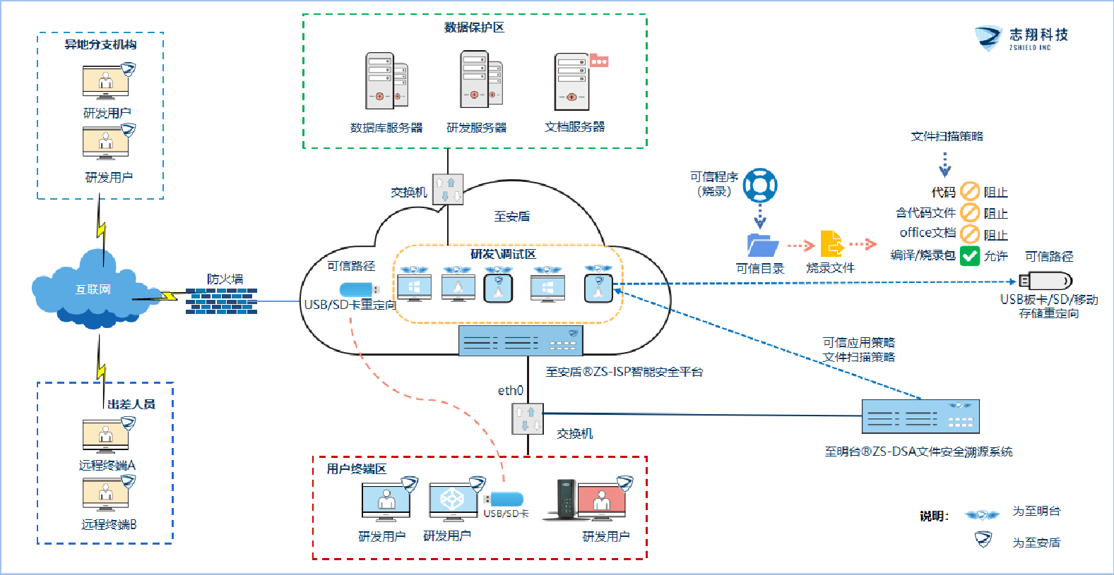 针对以上需求,志翔科技设计了基于至安盾?智能安全平台的研发/办公数据安全访问及管控方案,代替客户原有VNC接入。这套方案提供包括统一安全接入、安全桌面、数据集中隔离?;?、用户行为管控等在内的多项功能。方案支持文件安全流转、远程烧录调试安全管控等,所有文件操作、流转行为全记录可审计与追溯,满足合规需求。同时方案体验高效、部署快捷、运维简单,能很好兼顾数据安全与研发效率。