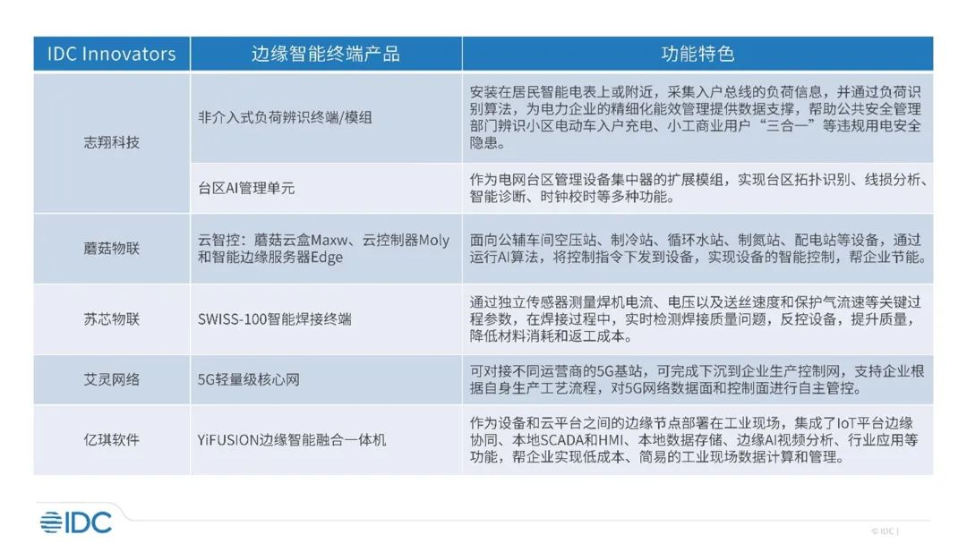 本次IDC Innovators报告筛选了2023年在工业边缘智能终端领域5个典型创新者,其创新产品简介如下图所示: